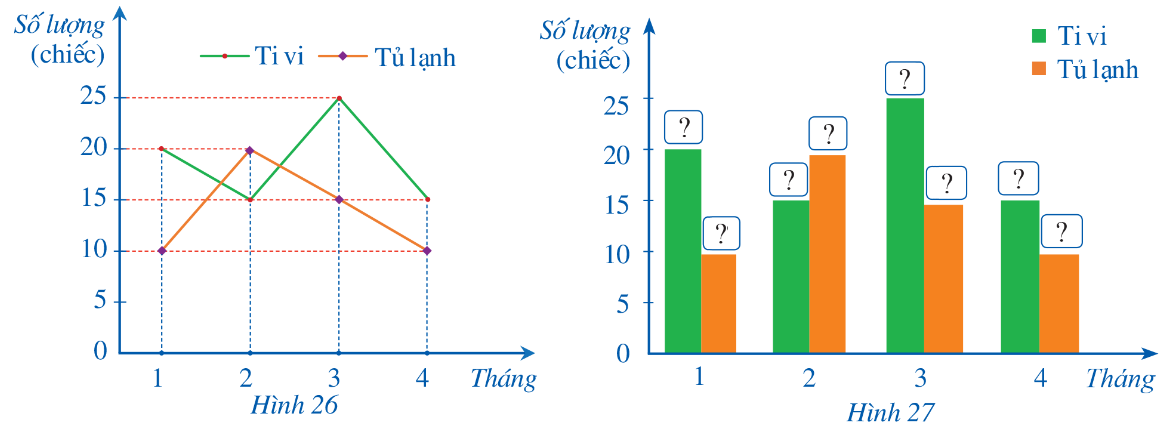 Biểu đồ đoạn thẳng ở Hình 26 biểu diễn số lượng ti vi và tủ lạnh bán được trong tháng 1, tháng 2 , tháng 3, tháng 4 của một cửa hàng kinh doanh. Hãy hoàn thiện biểu đồ ở Hình 27 để nhận được biểu đồ cột kép biểu diễn các dữ liệu trong biểu đồ đoạn thẳng ở Hình 26.