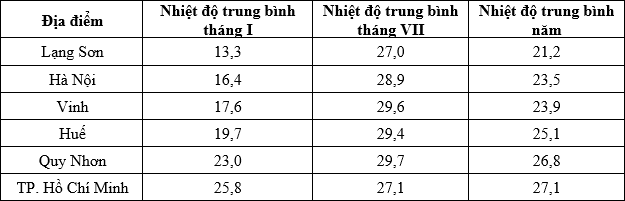 Cho bảng số liệu: NHIỆT ĐỘ TRUNG BÌNH TẠI MỘT SỐ ĐỊA ĐIỂM (Đơn vị: °C) (Nguồn: Sách