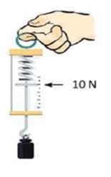 Lực kế trong hình bên đang chỉ ở vạch 10 N. Nếu lấy \(g = 9,8\,\,m/{s^2}\). Khối lượng của