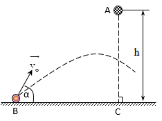 c) Cùng lúc đó từ B cách C đoạn BC = 180 m người ta ném một vận khác với vận tốc ban đầu \({v_0}\) hợp với phương ngang góc \(\alpha \). Tính \(\alpha \) và \({v_0}\) để hai vật gặp được nhau khi chúng đang chuyển động.