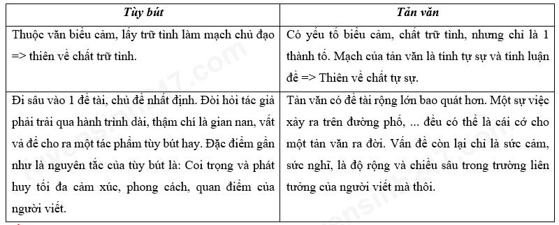 Phân biệt sự khác nhau giữa tùy bút và tản văn.