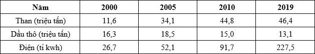 Cho bảng số liệu: SẢN LƯỢNG THAN, DẦU THÔ VÀ ĐIỆN CỦA NƯỚC TA, GIAI ĐOẠN 2000 -