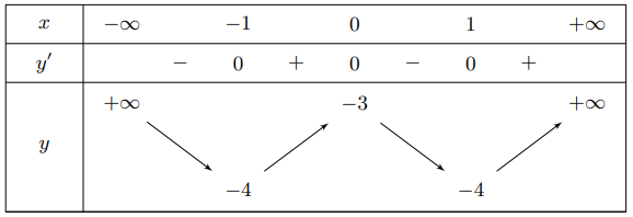 Cho hàm trùng phương \(y = a{x^4} + b{x^2} + c(a \ne 0)\) có bảng biển thiên như hình vẽ bên. Tính