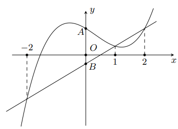 Cho hàm số bậc ba \(y = f\left( x \right)\) và hàm số bậc nhất \(y = g\left( x \right)\) có đồ thị lần lượt là đường cong và đường thẳng trong hình vẽ bên. Gọi \(A,B\) lần lượt là giao điểm của đồ thị hàm số \(y = f\left( x \right)\) và \(y = g\left( x \right)\) với trục tung. Biết \(AB = 4\), bất phương trình \(f\left( x \right) - 4 \le g\left( x \right)\) có bao nhiêu nghiệm nguyên trên đoạn \(\left[ { - 10;10} \right]\) ?