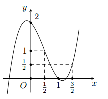 Cho hàm bậc ba \(y = f\left( x \right)\) có đồ thị là đường cong trong hình vẽ bên. Tính tổng các nghiệm thuộc khoảng \(\left( {0;\pi } \right)\) của phương trình \(\left( {2 - {\rm{cos}}2x} \right)f\left( {{\rm{si}}{{\rm{n}}^2}x} \right) - 2 = 0\).