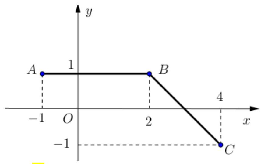 Cho đường gấp khúc \(ABC\) trong hình vẽ là đồ thị của hàm số \(y = f\left( x \right)\) trên đoạn \(\left[ { - 1;4} \right]\). Tích phân bằng