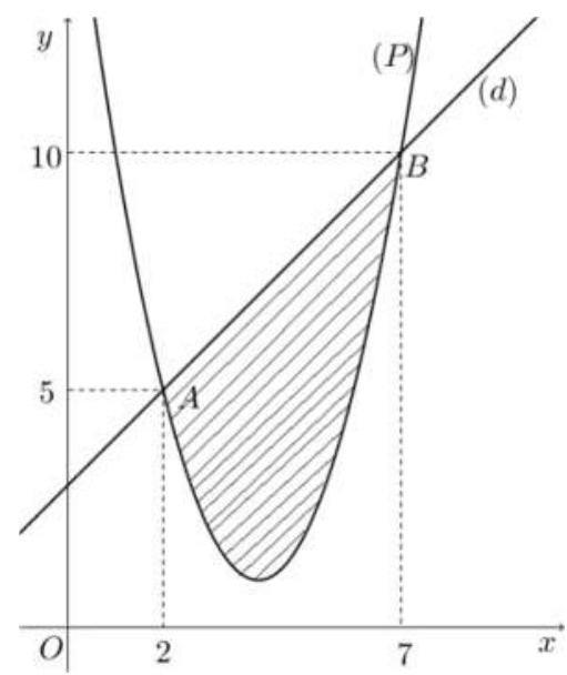 Cho hàm số bậc hai \(y = f\left( x \right)\) có đồ thị \(\left( P \right)\) và đường thẳng \(d\) cắt tại hai điểm như trong hình bên. Biết rằng hình phẳng giới hạn bởi \(\left( P \right)\) và \(d\) có diện tích \(S = \dfrac{{125}}{6}\). Tích phân \(\int_2^7(2 x-3) f^{\prime}(x) \mathrm{d} x\) bằng