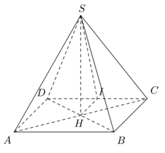 Cho hình chóp đều S.ABCD có cạnh đáy bằng \(a\sqrt 2 \) và đường cao SH bằng \(\dfrac{{a\sqrt 2