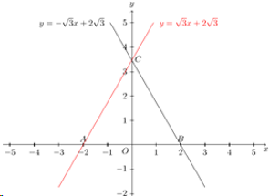 Cho hai đường thẳng \({d_1}:y = \sqrt 3 x + 2\sqrt 3 ,\,\,{d_2}:y = - \sqrt 3 x + 2\sqrt 3 \). Đường thẳng \({d_1}\) cắt trục hoành tại \(A,\,\,{d_2}\) cắt trục hoành tại \(B;\,\,{d_1},\,\,{d_2}\) cắt nhau tại \(C\). Diện tích tam giác \(ABC\) là