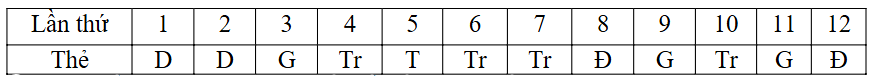 Bạn Liên có 5 thẻ ghi riêng từng loại từ trong Tiếng Anh đã học: danh từ (D) , động từ (Đ), tính từ (T), trạng từ (Tr), giới từ (G) và xác định xem thẻ đó có từ thuộc loại nào. Liên lấy ngẫu nhiên 1 thẻ trong số 5 thẻ đó và thực hiện thí nghiệm này 12 lần (trả lại thẻ sau mỗi lần lấy) và thu được kết quả như sau: