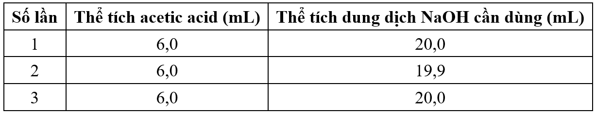 Cho thí nghiệm: Chuẩn độ acetic acid bằng dung dịch sodium hydroxide 0,15 M. Sau khi thực hiện thí nghiệm chuẩn độ này 3 lần, thu được bảng dưới đây: