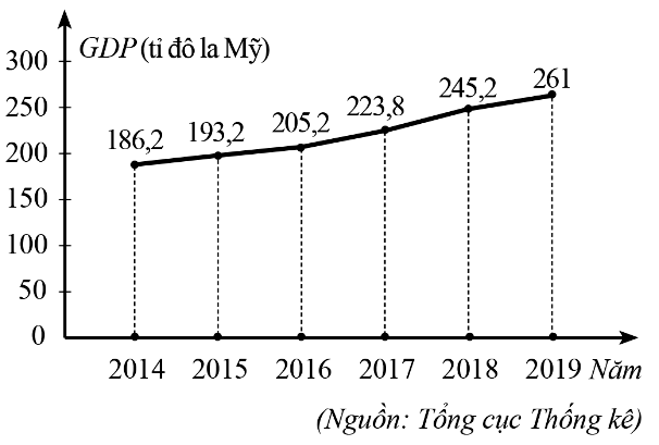 Biểu đồ đoạn thẳng dưới đây biểu diễn tổng đóng góp GDP (tỉ đô la Mỹ) ở các lĩnh vực kinh tế (Dịch vụ, Nông nghiệp, Công nghiệp và Xây dựng) của Việt Nam từ năm 2014 đến năm 2019.