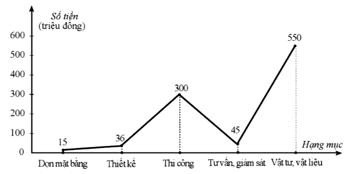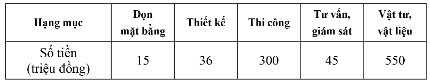 Bác An dự định xây một ngôi nhà mặt bằng \(60\;{{\rm{m}}^2}\), cao 3 tầng. Số tiền cần phải chuẩn bị cho các hạng mục theo dự tính như sau: