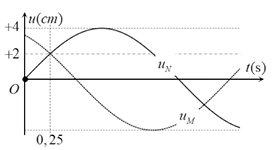 Sóng ngang truyền trên mặt chất lỏng với tốc độ 3 cm/s. Xét hai phần tử M và N nằm trên một phương truyền sóng có vị trí cân bằng cách nhau một khoảng nhỏ hơn bước sóng. Đồ thị biểu diễn li độ sóng của M và N theo thời gian t như hình vẽ. Khoảng cách giữa hai phần tử chất lỏng tại M và N vào thời điểm t = 2,25s là