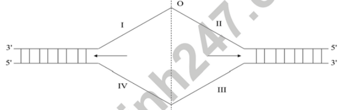 Một đoạn ADN nằm ở khoảng giữa 1 đơn vị nhân đôi như hình vẽ (O là điểm khởi đầu sao chép; I, II, III, IV chỉ các đoạn mạch đơn của ADN). Trong các phát biểu sau đây, phát biểu nào sai?