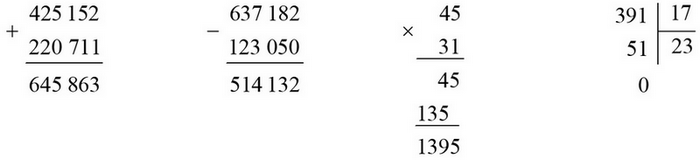 Đặt tính rồi tínha) 425 152 + 220 711b) 637 182 – 123 050c) 45 \( \times \) 31d) 391 :