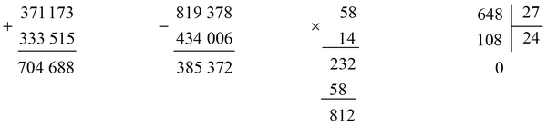 Đặt tính rồi tínha) 371 173 + 333 515b) 819 378 – 434 006c) 58 \( \times \) 14d) 648 :