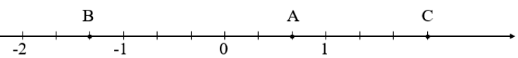 Trong hình vẽ, các điểm \({\rm{A}},{\rm{B}},{\rm{C}}\) theo thứ tự biểu diễn các số hữu tỉ