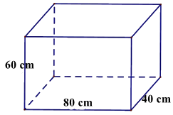 Nhà Mai có một bể cá bằng kính hình hộp chữ nhật có kích thước như hình vẽ. Để nuôi cá nhà Mai đã đổ nước cách miệng bể \(20{\rm{\;cm}}\). Tính số lít nước nhà Mai đã đổ vào bể. (Coi độ dày kính không đáng kể)