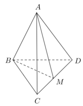 Cho tứ diện \(ABCD\) có các mặt \(ACD\) và \(BCD\) là các tam giác đều cạnh bằng \(2\), góc giữa