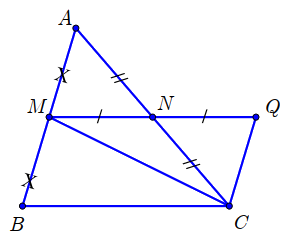 Cho tam giác \(ABC\) nhọn. Gọi \(M\) là trung điểm của cạnh \(AB\), gọi \(N\). là trung điểm của cạnh \(AC\). Trên tia đối của tia \(NM\) lấy điểm \(Q\) sao cho \({\rm{NQ}} = {\rm{NM}}\). Chứng minh rằng: