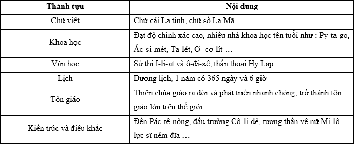 Lập bảng về một số thành tựu tiêu biểu của nền văn minh Hy Lạp- La Mã theo gợi ý