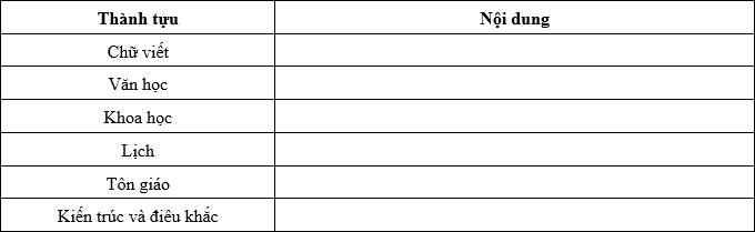 Lập bảng về một số thành tựu tiêu biểu của nền văn minh Hy Lạp- La Mã theo gợi ý sau