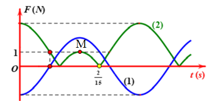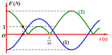 Một con lắc lò xo treo thẳng đứng được kích thích cho dao động điều hòa. Một phần đồ thị biểu diễn sự phụ thuộc thời gian của lực phục hồi và độ lớn của lực đàn hồi tác dụng vào con lắc trong quá trình dao động được cho như hình vẽ. Lấy \(g = 10 = {\pi ^2}\,\,\left( {m/{s^2}} \right)\). Độ cứng của lò xo là