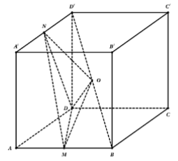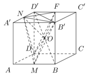 Cho hình lập phương có \(M,N,O\) lần lượt là trung điểm của \(AB,A'D',BD'\) (tham khảo hình bên).