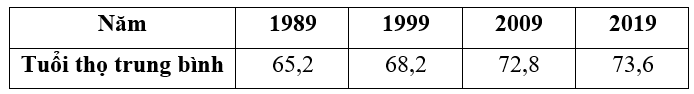 a) Lập bảng thống kê tuổi thọ trung bình của người Việt Nam trong các năm 1989, 1999, 2009, 2019 (đơn vị: tuổi)