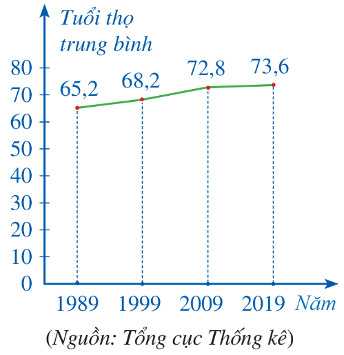 Biểu đồ đoạn thẳng dưới đây biểu diễn tuổi thọ trung bình của người Việt Nam qua 30 năm (từ năm 1989 đến năm 2019).