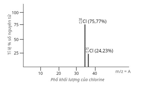 Tỉ lệ phần trăm số nguyên tử các đồng vị tự nhiên của chlorine (Cl) được xác định theo phổ khối lượng sau: