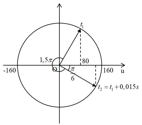 Điện áp ở hai đầu một đoạn mạch là $u = 160\cos 100\pi t\,\,(V)$ (t tính bằng giây). Tại thời điểm $t_{1}$, điện áp ở hai đầu đoạn mạch có giá trị là 80 V và đang giảm. Đến thời điểm $t_{2} = t_{1} + 0,015\,\, s$, điện áp ở hai đầu đoạn mạch có giá trị bằng