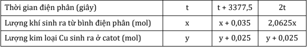 Tiến hành điện phân dung dịch chứa m gam hỗn hợp muối CuSO4 và NaCl bằng dòng điện một chiều có cường độ 2A (với điện cực trơ, có màng ngăn xốp). Kết quả thí nghiệm được ghi trong bảng sau: