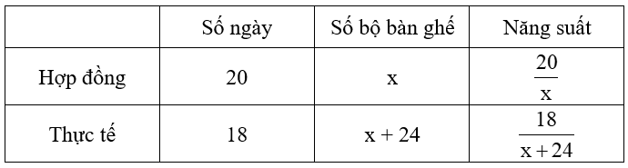 Một xí nghiệp mộc kí hợp đồng đóng và giao một số bộ bàn ghế học sinh cho một trường học trong 20 ngày. Do nhà trường đã đặt thêm 24 bộ bàn ghế nữa nên xí nghiệp đã cải tiến kĩ thuật, nhờ đó năng suất của xí nghiệp đã tăng \(20\% \). Bởi vậy, chỉ trong 18 ngày xí nghiệp đã hoàn thành hợp đồng. Tính số bộ bàn ghế mà xí nghiệp phải đóng theo hợp đồng lúc đầu.