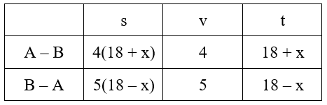 Một ca nô xuôi dòng từ bến \(A\) đến bến \(B\) mất 4 giờ và ngược dòng từ \(B\) về \(A\) mất 5 giờ. Biết vận tốc riêng của ca nô luôn giữ không đổi là \(18\;{\rm{km}}/{\rm{h}}\). Tính vận tốc của dòng nước.