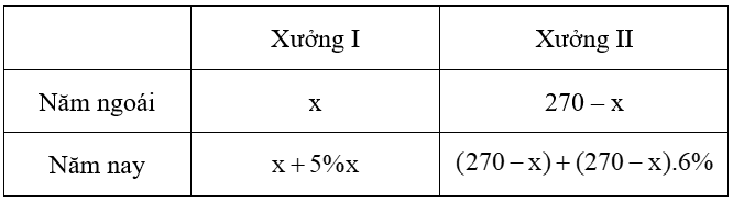 Năm ngoái, tổng số công nhân của hai phân xưởng là 270 người. Năm nay, số công nhân của phân xưởng I tăng 5%, số công nhân của phân xưởng II tăng 6% nên tổng số công nhân của hai phân xưởng là 285 người. Hỏi năm nay, mỗi phân xưởng có bao nhiêu công nhân?