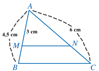 Cho tam giác ABC có \(AB = 4,5\;{\rm{cm}},AC = 6\;{\rm{cm}}\). Các điểm M, N lần lượt thuộc các cạnh AB, AC thoả mãn \(AM = 3\;{\rm{cm}}\) và \(MN\parallel BC\). Tính độ dài đoạn thẳng AN.