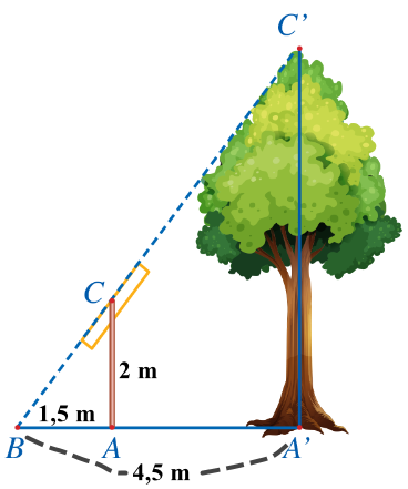 Trong hình dưới đây, độ dài đoạn thẳng \(A'C'\) mô tả chiều cao của một cái cây, đoạn thẳng AC mô tả chiều cao của một cái cọc (cây và cọc cùng vuông góc với đường thẳng đi qua ba điểm \(\left. {A',A,B} \right)\). Giả sử \(AC = 2\;{\rm{m}},AB = 1,5\;{\rm{m}},A'B = 4,5\;{\rm{m}}\). Tính chiều cao của cây.