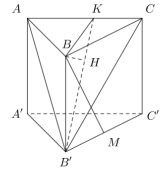 Cho khối lăng trụ đứng \(ABC.A'B'C'\) có \(\widehat {BAC} = 60^\circ \), \(AB = 6a\) và \(AC = 8a\). Gọi \(M\) là trung điểm của \(B'C'\), biết khoảng cách từ \(M\) đến mặt phẳng \(\left( {B'AC} \right)\) bằng \(\dfrac{{3a\sqrt {15} }}{5}\). Thể tích khối lăng trụ bằng