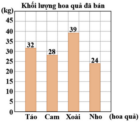 Quan sát biểu đồ sau:Tổng khối lượng táo và xoài nhiều hơn tổng khối lượng cam và nho là