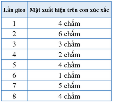 Các bạn Thảo và Ly cùng gieo một con xúc xắc trong 8 lần và ghi lại kết quả trong bảng dưới đây: