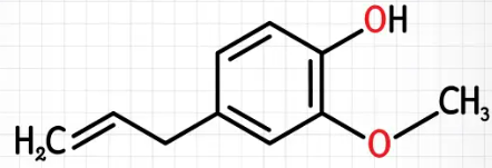Eugenol là chất lỏng nhờ không màu đến màu vàng nhạt, có mùi thơm. Được tách ra từ cây đinh hương, hương nhu hoặc lá quế có công thức cấu tạo như sau:
