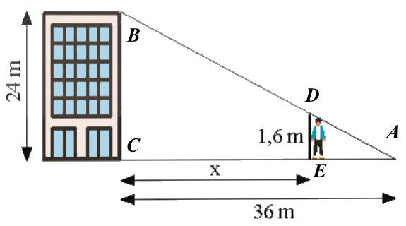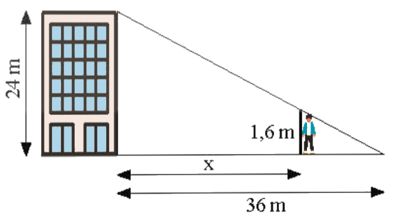 Một toà nhà cao 24 m, đổ bóng nắng dài \(36\;{\rm{m}}\) trên đường như hình sau. Một người cao 1,6 m muốn đứng trong bóng râm của toà nhà. Hỏi người đó có thể đứng cách toà nhà xa nhất bao nhiêu mét?