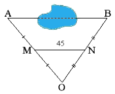 Để đo khoảng cách giữa hai điểm \({\rm{A}}\) và \({\rm{B}}\) bị ngăn cách bởi một hồ nước, người ta đóng các cọc tại các vị trí A, B, M, N, O như hình sau và đo được \({\rm{MN}} = 45\;{\rm{m}}\). Tính khoảng cách \({\rm{AB}}\) biết \({\rm{M}},{\rm{N}}\) lần lượt là trung điểm \({\rm{OA}},{\rm{OB}}\).