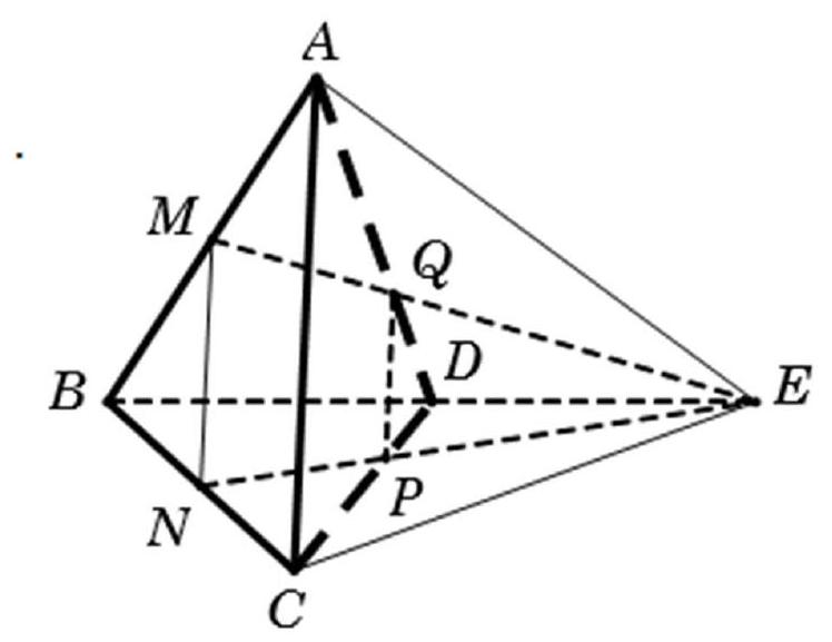 Cho tứ diện đều \(ABCD\) có cạnh bằng \(2a\). Gọi \(M,N\) lần lượt là trung điểm của các cạnh \(AB,BC\) và \(E\) là điểm đối xứng với \(B\) qua \(D\). Mặt phẳng \(\left( {MNE} \right)\) chia khối tứ diện \(ABCD\) thành hai khối đa diện, trong đó khối đa diện chứa đỉnh \(A\) có thể tích \(V\). Tính \(V\).