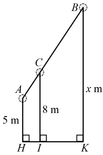 Hình dưới đây mô tả ở một nhà máy, người ta dùng một băng chuyền để chuyển nguyên vật liệu. Ba vòng quay A, B, C của băng chuyền đặt cách mặt đất ở các độ cao lần lượt là \(AH = 5(\;{\rm{m}})\), \(CI = 8(\;{\rm{m}}),BK = x(\;{\rm{m}})\).