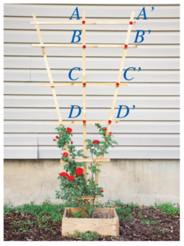 Cho hình sau, các thanh \(A{A^\prime },B{B^\prime },C{C^\prime },D{D^\prime }\) của giàn gỗ song song với