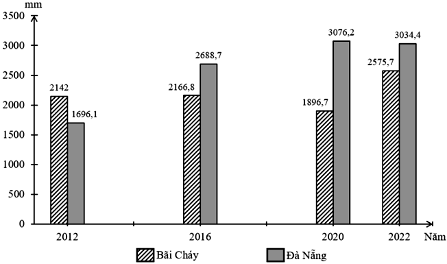 Cho biểu đồ về tổng lượng mưa tại một số trạm quan trắc ở nước ta qua các năm: