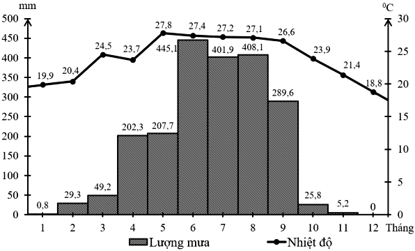 Cho biểu đồ: NHIỆT ĐỘ VÀ LƯỢNG MƯA CỦA TRẠM KHÍ HẬU LAI CHÂU NĂM 2021 (Nguồn: Tổng cục